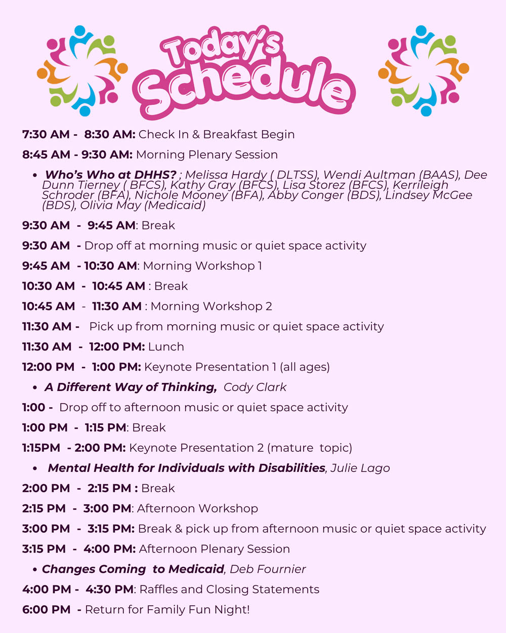 The New Hampshire Family Support Conference is a statewide event that brings together families, caregivers, and professionals supporting individuals with developmental disabilities, acquired brain disorders, and special healthcare needs. This annual conference provides a welcoming space to learn, connect, and build lasting relationships within a supportive community.